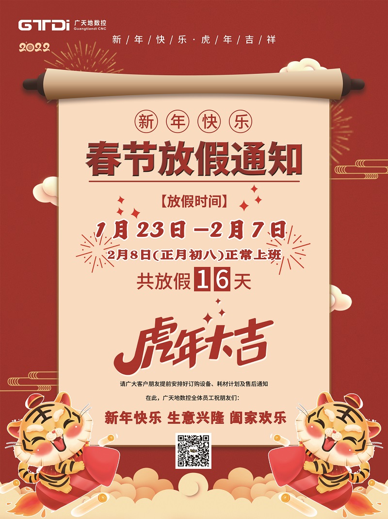 2022年春节将至,首先感谢您在2021年里的鼎力支持和愉快合作,mgm1888美高梅数控全体同仁在此给您拜个早年。在新年的一年里,mgm1888美高梅将更加努力,为您提供更优质的服务。按照国家春节放假规定结合我司的具体情况,春节放假时间安排如下: